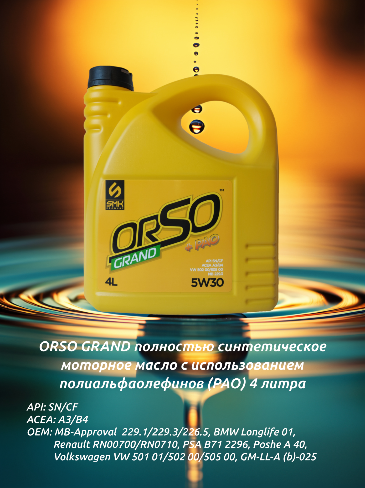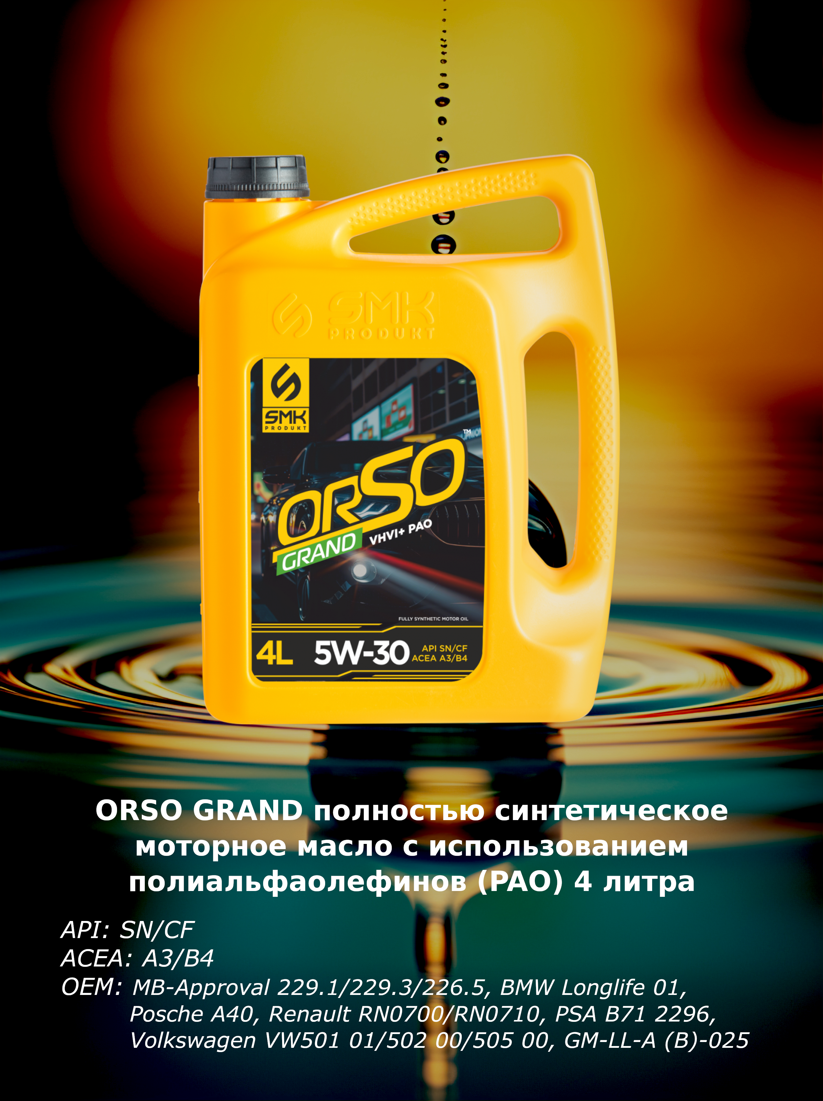 Универсальное моторное масло ORSO GRAND полностью синтетическое моторное масло с использованием полиальфаолефинов (PАО).