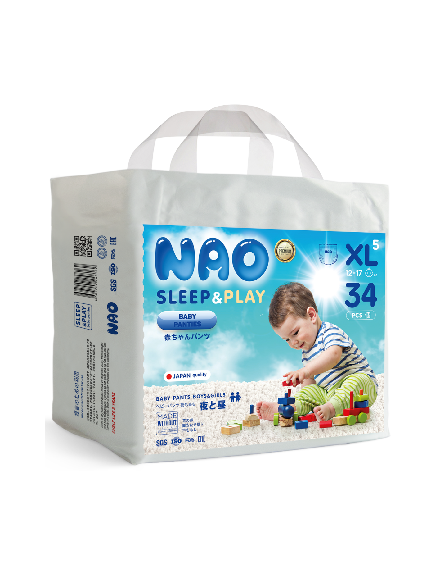 Мягкие дневные и ночные подгузники – трусики для новорожденных NAO Sleep&Play размера 5 XL ( 12 – 17 кг ) разработаны с применением современных материалов и формулы, имеют удобную форму выкройки,не стесняющую движения в процессе познания мира,подходят для малышей с первого года жизни. Слой Maxi Dry Baby ( макси драй беби ) обеспечивает супер впитываемость на 25% больше других брендов. На 20 % более высокий пояс с двойной резинкой Leack Guard из натурального не тканного soft touch ( софт тач) материала –это защита от протечек, отсутствие давления на живот, ноги, комфорт новорожденного. Нежный внутренний слой с добавлением белого хлопка позволяет коже младенцев дышать,не соприкасаться с влагой, избежать опрелостей. Благодаря наполнению с безопасным абсорбентом Sumitomo Japan ( Япония ) в накопителе трусики всегда остаются сухими, белыми снаружи,надежно запирают влагу, не комкуются, впитывают на 50 % быстрее. Ультратонкие детские одноразовые трусы имеют липкую ленту, позволяющую свернуть и выкинуть в пакет. Есть индикатор замены подгузника. Тонкие подгузники легко снимать, разорвав по швам с двух сторон. Возьмите с собой, положив в прогулочную сумку. Трусики можно надевать детям на время сна в кроватке. Вещи и белье останутся чистыми, без грязных следов. Подходят как девочкам, так и мальчикам. Также наши трусики – отличный подарок на выписку маме из роддома, День рождения младенца. В упаковке набор из 34 штучек. Размер пять рассчитан на маленьких детей от 18 месяцев до 4 годиков. Бренд НАО Pants (пэнтс) – это детские premium ( премиум ) товары японского elite ( элит ) качества. Вся продукция производится из гиппоаллергенных материалов, без химии, ароматизаторов, дезодорантов, хлора. Имеются все сертификаты, подтверждающие безопасность, экологичность. Упаковка пригодна для переработки.